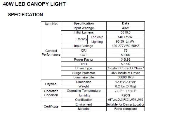 40W LED Canopy is an ideal replacement of metal halide fixtures for safe, brightly-lit outdoor environments and widely used at undergound parking, Gas Station, and other areas. These 40-watt LED fixtures are energy-efficient replacements for 175-watt metal halide fixtures and save energy, lower maintenance costs, and prevent light pollution.