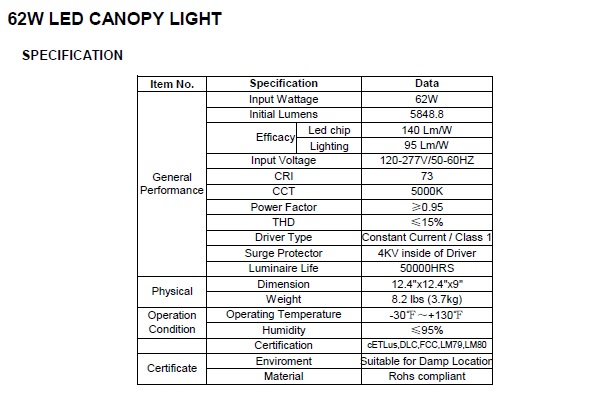 2W LED Canopy Light is an ideal replacement of metal halide fixtures for safe, brightly-lit outdoor environments and widely used in under ground parking, Gas Station, and other areas. These 60-watt LED fixtures are energy-efficient replacements for 250-watt metal halide fixtures and save energy, lower maintenance costs, and prevent light pollution.
